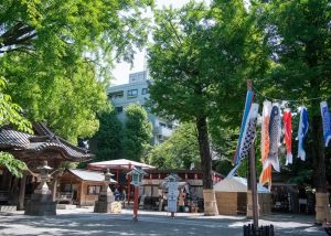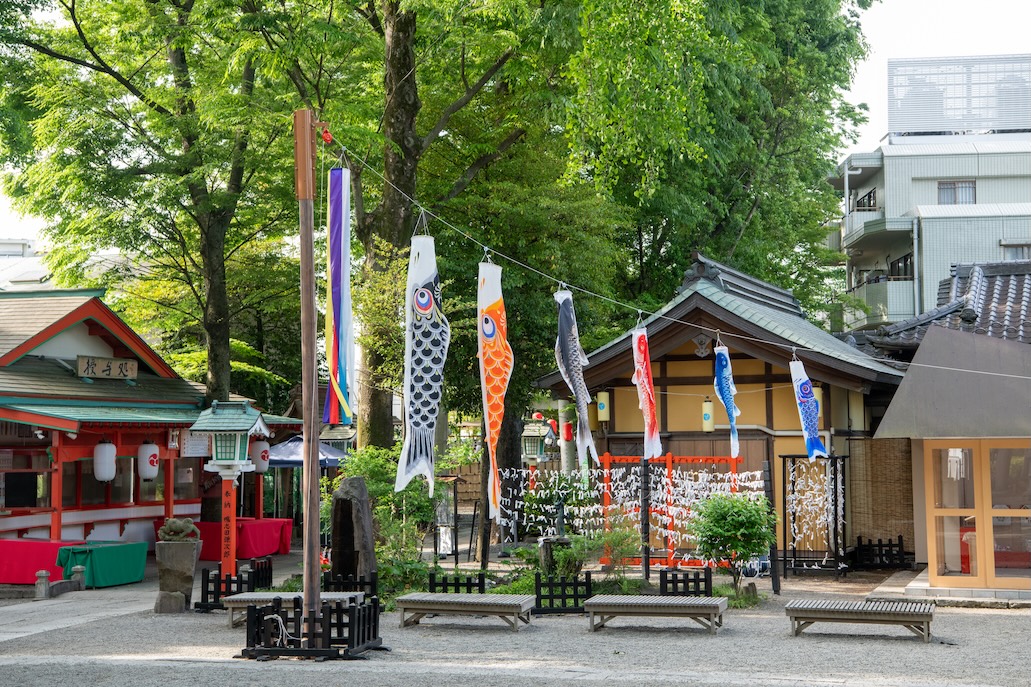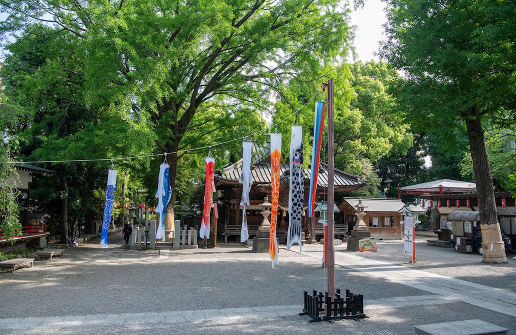 田無神社の境内には、春の爽やかな薫風が吹き込み、その風に乗って鯉のぼりが気持ちよさそうにたなびきます。なお、安全対策のため、ヒノキ製の鯉のぼりの竿は例年より短くしております。大きく美しい鯉のぼりを、ぜひお子様やお孫様とご一緒にご覧ください。