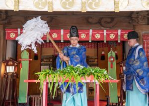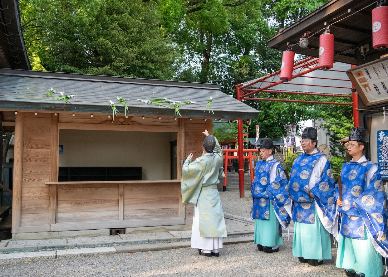 端午の節句に際し、5月4日(月)午後4時より「端午前日祭」をご斎行いたします。邪気を祓う菖蒲を祓物として待合殿の屋根に投げ入れ、災いを除ける神事を執り行います。
